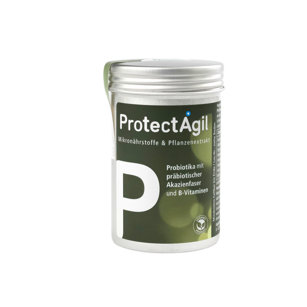 ProtectAgil unterstützt die körpereigenen Abwehrkräfte. B-Vitamine stärken dein Immunsystem. Biotin ist für eine gesunde Darmschleimhaut wichtig. Eine gesunde Darmflora stärkt das Immunsystem. Probiotika haben eine positive Wirkung auf unsere Darmflora. Probiotika sind lebende Mikroorganismen, die natürlicher Weise im Darm vorkommen. Sie können aber auch über Lebensmittel und z.B. Nahrungsergänzungsmittel aufgenommen werden. Da die Darmflora für unser Immunsystem entscheidend ist, können Probiotika unser Immunsystem stabilisieren. Auch Präbiotika sind bezüglich Darmgesundheit und einer harmonischen Darmflora bedeutend. Als Präbiotika bezeichnet man unverdauliche Ballaststoffe, die den Bakterien im Dickdarm als Nahrungsquelle dienen. Sie unterstützen das Wachstum der eigenen Darmflora und begünstigen somit die Darmbesiedlung von gesundheitsfördernden Bakterien.